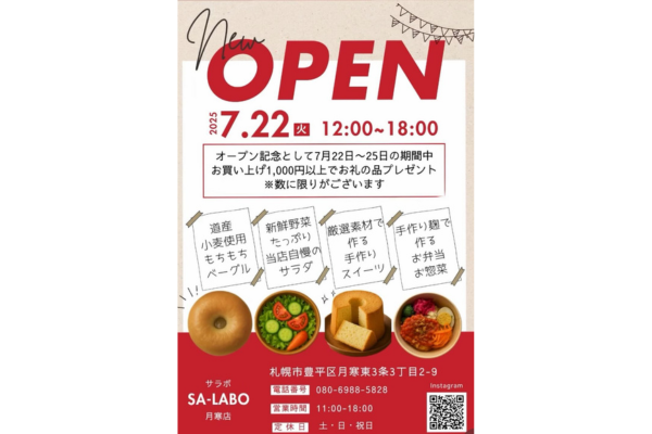 ![]() SA-LABO月寒店は白石店同様に ↓道産小麦のベーグル🥯 ↓道産食材使用のスイーツ🍰 ↓麹を使ったお弁当&惣菜🍱 ↓契約農家の野菜販売🥬などがメインになります! また、今後は自社商品の開発にも力を入れて🍝【自家製パスタ […] |
