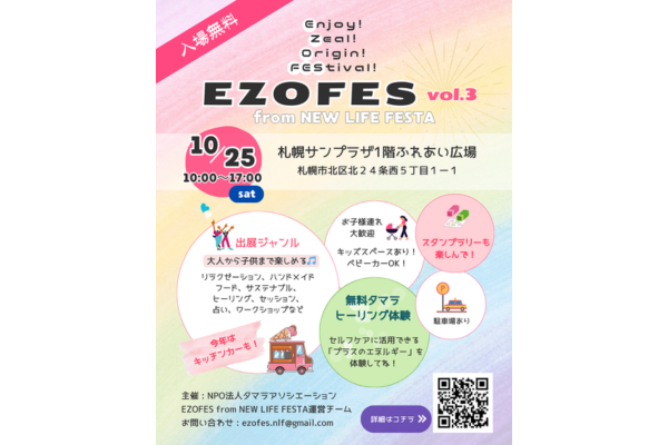 ![]() 今年で3回目となります北海道開催のEZOFES from NEW LIFE FESTA が10月25日(土)に行われます。リラクゼーション、ハンドメイド、占い、セッションなどに加えてお子様も楽しめるワークショップ、そし […] |