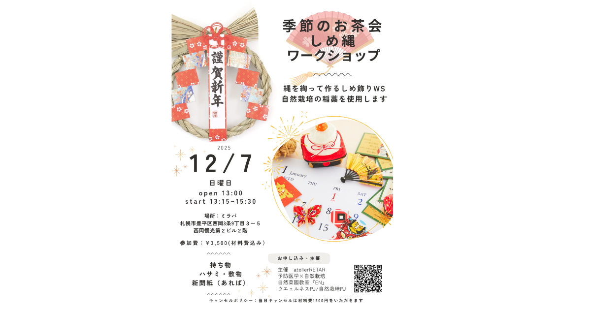 自然栽培の稲藁を使い、 “縄を綯うところから作る” しめ飾りワークショップ [開催情報] 日程:2025年12月7日(日) open:13:00 start:13:15〜15:30 場所:ミラバ 札幌市豊平区西岡3条9丁 […]