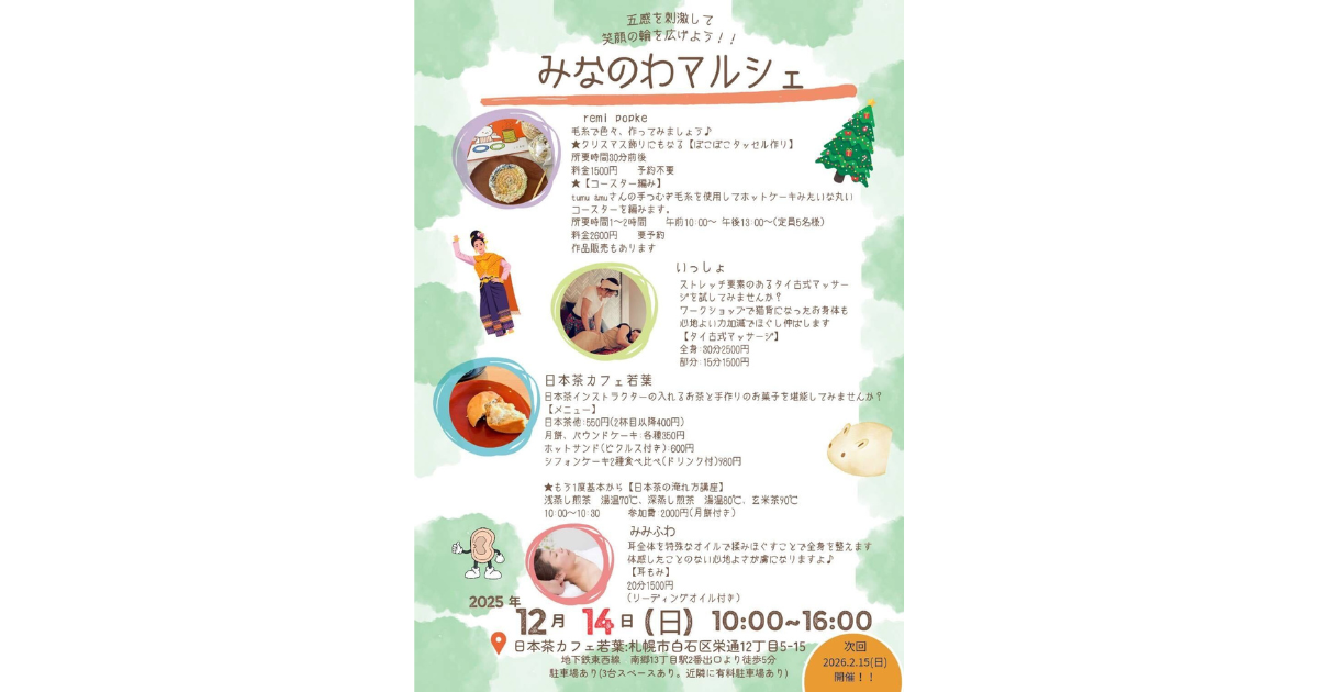 ![]() 日本茶カフェ若葉さんで開催される 【みなのわマルシェ】に @いっしょが タイ古式マッサージで出店させていただきます✨ ●出店者紹介● 🪡レミポッケ🧶 毛糸で色々、作ってみましょう♪ ★クリスマス飾りにもなる【ぽこぽこタッ […]