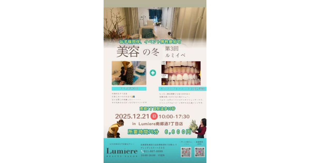 ![]() 南郷7丁目駅からすぐのサロン🦷✨👂💎 Lumiere (ルミエール)さんにて 第三回コラボイベント『ルミイべ』 2025・12・21(日)10:00~17:30開催決定‼️ 🎄Xmas前にケアしてウキウキした気持ちでXm […]