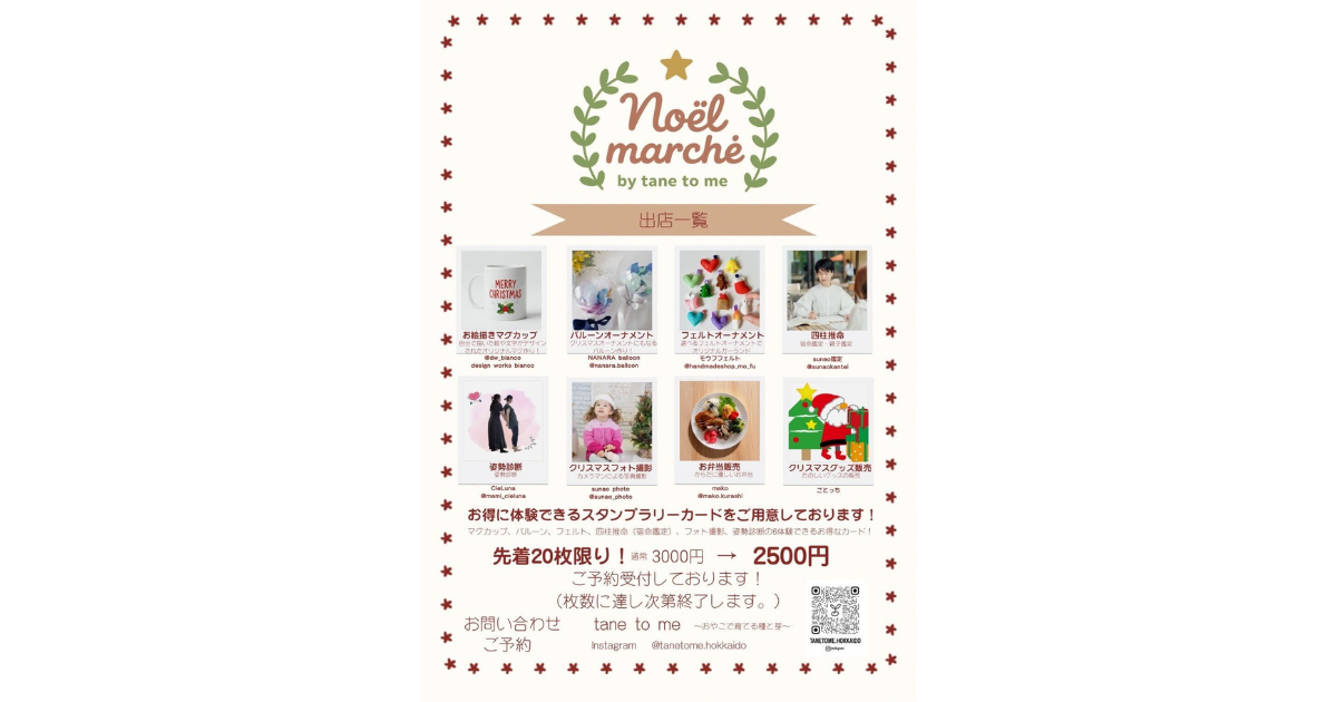 ![]() 14日に創世スクエアにてイベント出店します♡sunao は小さなフォトブースでワンコインからの撮影会をします!Noel marche創世スクエア2階SCARTSスタジオ112月14日(日)10時〜15時半入場無料主催 t […] |